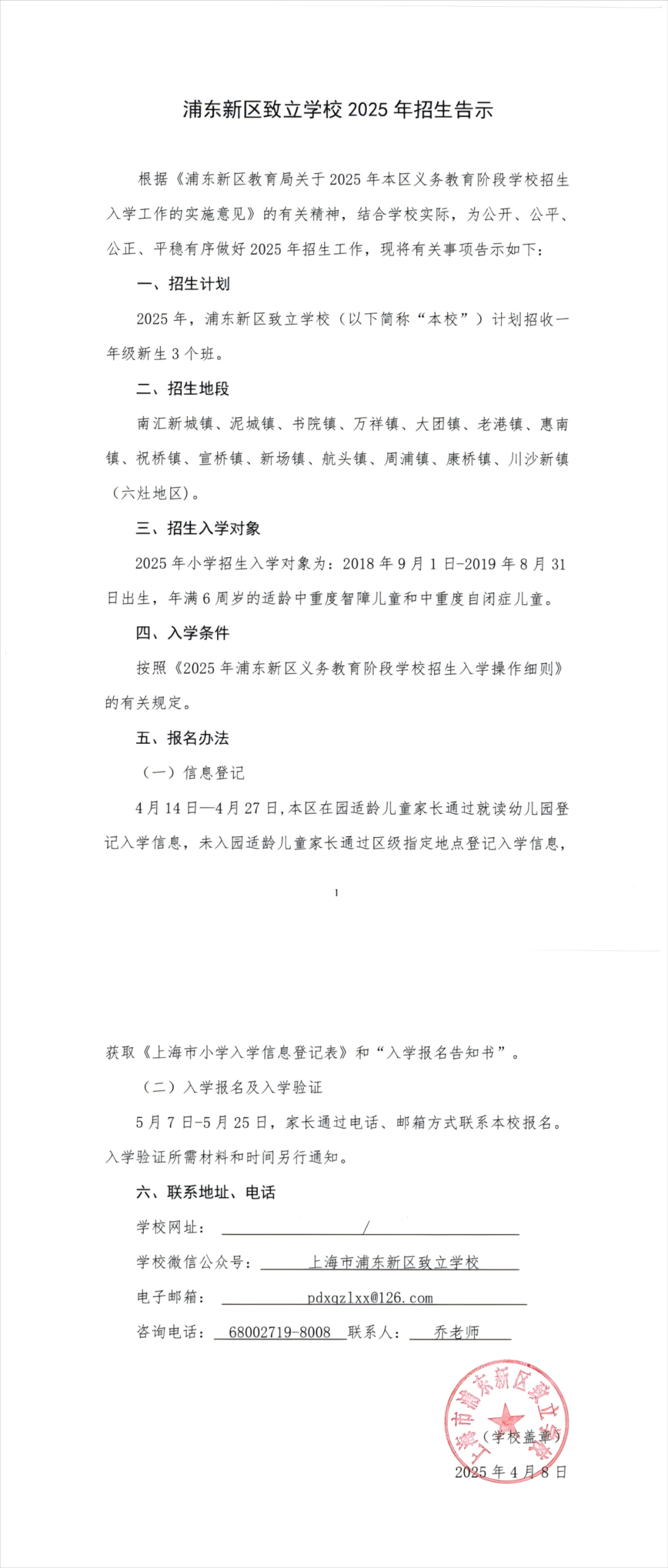 海市浦东新区致立学校位于上海市浦东新区惠南镇东门路85号,学校创于1999年,原名上海市南汇区致立学校,是原南汇唯一一所培智学校,2009年原浦东新区和原南汇区两区合并后后,改为现名。2015年原址启动新校舍的改扩建工程(合并了原成人学校),预计到2016年8月竣工搬迁至新校舍,新校园将占地4062平方米。学校现有教职工49人,164名学生。