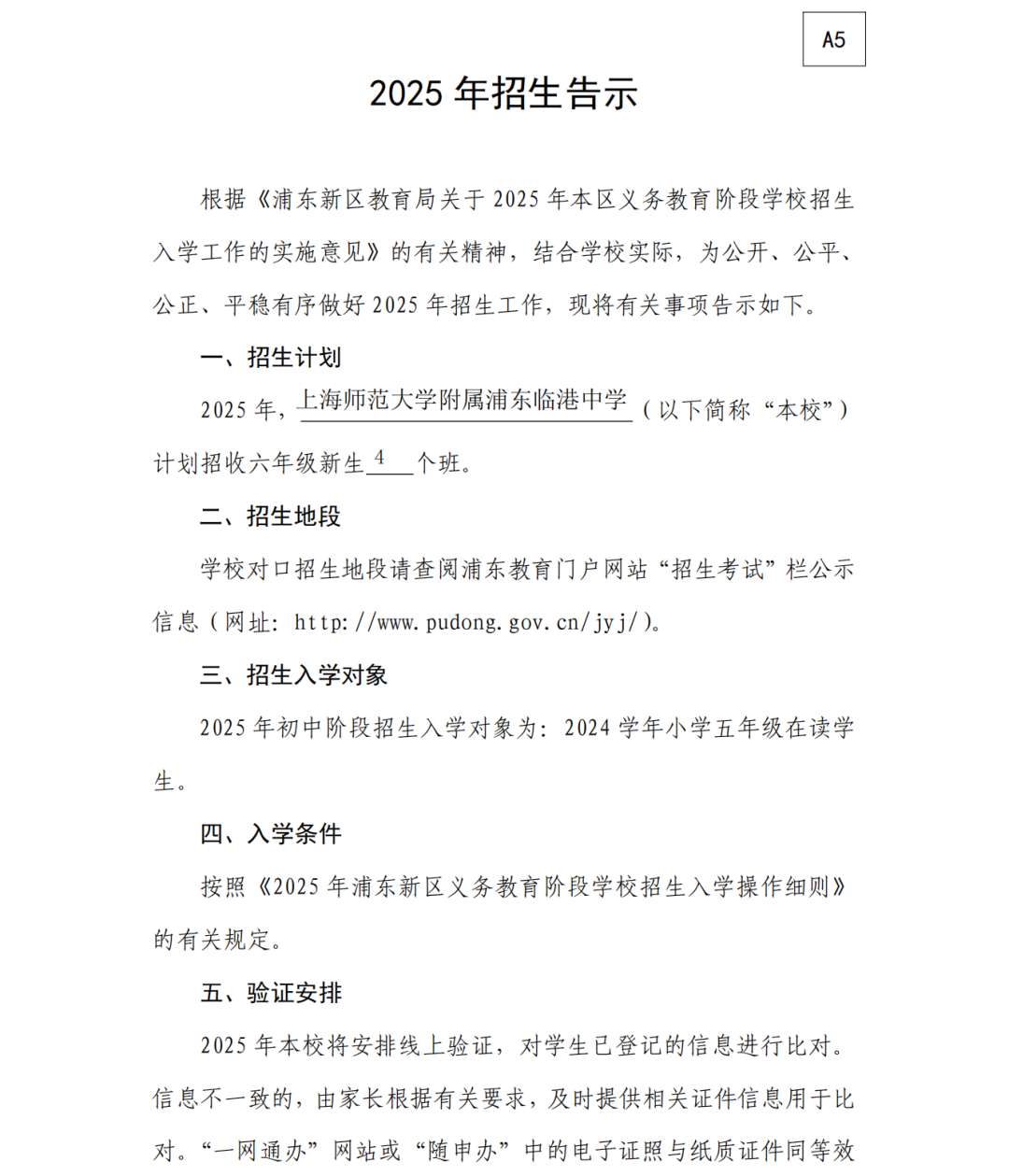 3.初中入学方式。本区公办初中按户籍、居住地段等信息对口安排学生入学,优先安排户籍地与实际居住地(具备相应的房产证)一致的学生对口入学。公办一贯制学校的小学毕业生原则上直接升入本校初中部就读,小学部实施“五年一孩”政策的一贯制学校,学生升入初中时仍按户籍、居住地段等信息对口安排入学。本区公办寄宿制学校限在本区范围内招生。