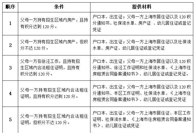 (3)幼儿园依据条件按序招生,如前一顺序已满,后一顺序将由徐泾地区公办幼儿园招生工作领导小组调剂安排进入其他公办园所。同一序位,以户籍申报迁入时间或房产登记时间依次排序录取。