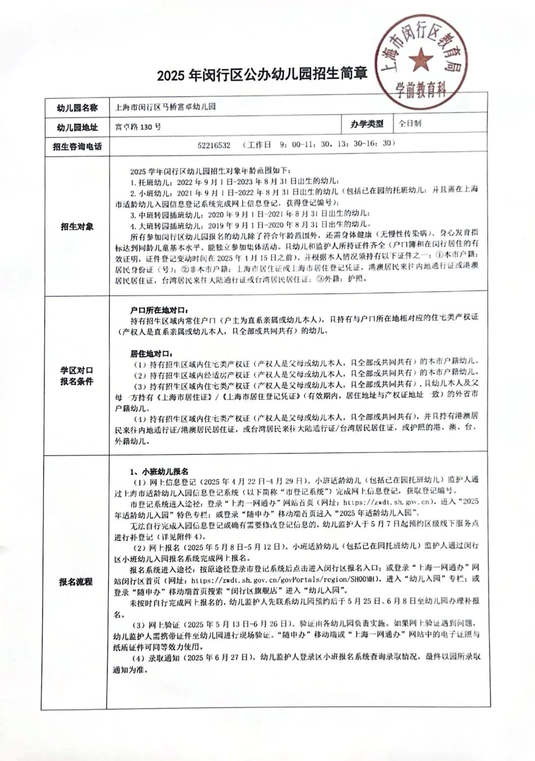 招生啦 闵行区马桥富卓幼儿园 小班幼儿招生简章 本园信息 幼儿园名称:上海市闵行区马桥富卓幼儿园 幼儿园地址:上海市闵行区富卓路130号 办学等级:二级 办学类型:全日制 招生信息 招生咨询电话 52216532 工作日 09:00-11:30,13:30-16:30 招生对象 2019 年 9 月 1 日-2020 年 8 月 31 日出生(包括在园托班幼儿),并且已在市登记系统完成网上信息登记、获取登记编号的幼儿。 对口报名条件 持有的相关证件/证明材料(包括幼儿户口簿、实际居住在闵行区的有效居住证明、《上海市居住证》/《上海市居住登记凭证》等)的变动(登记)时间为 2023 年 4 月 15 日之前、身体健康(无慢性传染病)、智力正常、能正常参加集体活动,并符合以下报名条件的适龄幼儿。 1.户口所在地对口: 持有招生区域内常住户口(户主为直系亲属或幼儿本人),并且持有与户口所在地相对应的住宅类产权证(产权人是直系亲属或幼儿本人,且全部或共同共有)的幼儿。 2.居住地对口: (1)持有招生区域内住宅类产权证(产权人是父母或幼儿本人,且全部或共同共有)的本市户籍幼儿。 (2)持有招生区域内经适房产权证(产权人是父母或幼儿本人,且全部或共同共有)的本市户籍幼儿。 (3)持有招生区域内住宅类产权证(产权人是父母或幼儿本人,且全部或共同共有),并且幼儿本人及父母一方持有《上海市居住证》/《上海市居住登记凭证》(有效期内,居住地址与产权证地址一致)的外省市户籍幼儿。 (4)持有招生区域内住宅类产权证(产权人是父母或幼儿本人,且全部或共同共有),并且持有港澳居民来往内地通行证/港澳居民居住证、台湾居民来往大陆通行证/台湾居民居住证的港、澳、台、外籍幼儿。 报名流程 本区小班适龄幼儿入园工作实行公民办幼儿园同步登记、同步报名、同步验证的方式,主要分为网上信息登记、网上报名、网上验证和录取通知四个阶段。 (1)网上信息登记 2023 年 4 月 20 日-4 月 27 日,小班适龄幼儿(包括在园托班幼儿)监护人通过上海市适龄幼儿入园信息登记系统(以下简称“市登记系统”,登录“上海一网通办”网站首页“2023 年适龄幼儿入园”特色专栏。 (2)网上报名 (3)网上验证 完成网上报名的幼儿自动进入第一批验证阶段。2023 年 5 月 16 日-5 月 18 日,幼儿园完成第一批网上验证。“随申办”移动端或“上海一网通办”网站中的电子证照与纸质证件可同等效力使用。 (4)录取通知 验证通过的幼儿自动进入录取阶段。2023 年 6 月 16 日,幼儿监护人登录区小班报名系统查询录取情况。遵循人户一致优先的原则,依据区小班报名系统中幼儿入园条件排序情况、幼儿实际报名情况及街镇、幼儿园资源配置情况,完成幼儿录取工作。 确有困难未能按时完成市网上信息登记、区网上报名的幼儿监护人可至闵行区线下服务点完成补登记、补报名。线下服务点实施预约制。幼儿监护人可及时关注“闵行教育”微信公众号发布的相关通知或拨打闵行区招生咨询电话,及时了解线下服务点的服务时间、预约方式等信息。 招生区域内小区及路段 银康路 76 弄 (银春苑) 银林路 100 弄(银康苑) 富卓路125弄(元景苑)暂定 富卓路195弄(马桥景城紫藤嘉苑)暂定 网上验证时间 第一批网上验证:5 月 16 日-5 月 18 日 如果网上验证遇到问题,幼儿园会与幼儿监护人联系,请保持手机畅通。验证期间,幼儿监护人有任何疑问,可直接电话咨询幼儿园。 第二批网上验证:5 月 30 日-5 月 31 日 未选择报名符合对口报名条件的公办幼儿园或民办幼儿园“小区生”,又未通过民办幼儿园“非小区生”或全区招生民办幼儿园第一批网上验证的幼儿,自动参加公办幼儿园或民办幼儿园“小区生”的第二批网上验证。部分已及时完成补报名的幼儿,自动参加第二批网上验证。 其他事项 收费标准:另见本园《教育收费公示》 注:中班/大班插班幼儿、托班幼儿及其他特殊情况的幼儿入园办法参照《2023 年闵行区学前教育阶段适龄幼儿入园工作实施意见》的相关要求。