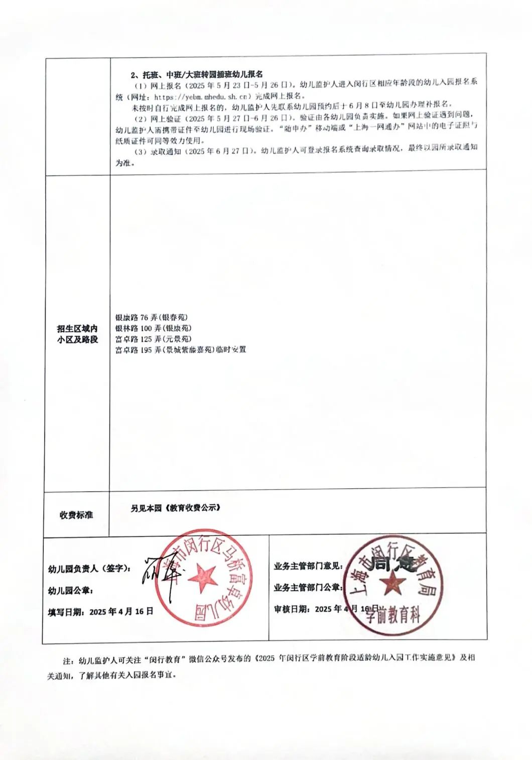 本区小班适龄幼儿入园工作实行公民办幼儿园同步登记、同步报名、同步验证的方式,主要分为网上信息登记、网上报名、现场验证和录取通知四个阶段。 1、网上信息登记。 2021年4月23日-4月30日,小班适龄幼儿(包括在园托班幼儿)监护人登录市登记系统(网址:https://shrydj.edu.sh.cn,也可通过“一网通办”进入)进行网上信息登记、获取登记编号。 2、网上报名。 2021年5月8日-5月12日,小班适龄幼儿(包括在园托班幼儿)监护人登录区报名系统(网址:https://yebm.mhedu.sh.cn)进行网上报名。 3、现场验证。 2021年5月14日,网上报名成功的适龄幼儿监护人登录区报名系统查询现场验证相关信息,并下载打印《闵行区幼儿园现场验证通知单》及《2021年闵行区幼儿园小班幼儿报名表》。 2021年5月15日-5月16日,适龄幼儿监护人持相关证件、携幼儿本人到指定幼儿园进行第一批现场验证。“随申办市民云”或“上海一网通办”网站中的电子证照与纸质证件可同等效力使用。 2021年5月29日,未选择报名符合对口报名条件的的公办幼儿园或民办幼儿园“小区生”,又未通过民办幼儿园“非小区生”或全区招生民办幼儿园面谈的幼儿,参加公办幼儿园或民办幼儿园“小区生”第二批现场验证。 4、录取通知。 2021年6月26日,遵循人户一致优先的原则,依据区报名系统中幼儿入园条件排序情况、幼儿实际报名情况及街镇、幼儿园资源配置情况,完成幼儿录取工作。幼儿监护人登录区报名系统查询录取情况。 2021年5月15日 08:30—11:30,13:00—16:00 2021年5月16日 08:30—11:30,13:00—16:00 (验证结果与验证先后顺序无关。根据疫情防控的要求,请幼儿本人及监护人按照《闵行区幼儿园现场验证通知单》规定时间错时前往,并自觉戴好口罩、一米间隔排队,避免拥挤和长时间等待。) 闵行区富卓路130号(闵行区马桥富卓幼儿园) 闵行35路、闵行37路B线:银康路富卓路站下 闵行29路、闵行30路:富卓路银春路站下 收费标准:另见本园《教育收费公示》 注:中班/大班插班幼儿、托班幼儿及其他特殊情况的幼儿入园办法参照《2021年闵行区学前教育阶段适龄幼儿入园工作实施意见》的相关要求。