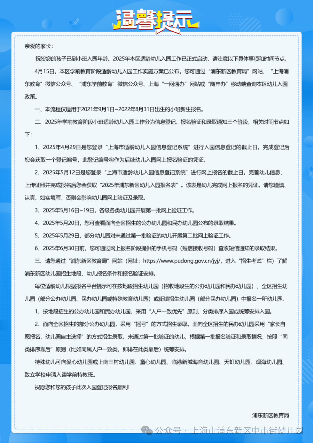 根据《浦东新区教育局关于2025年本区学前教育阶段适龄幼儿入园工作的实施方案》,结合本园实际,为公开、公平、公正做好本园2025年小班招生入园工作,现将有关事项告示如下: