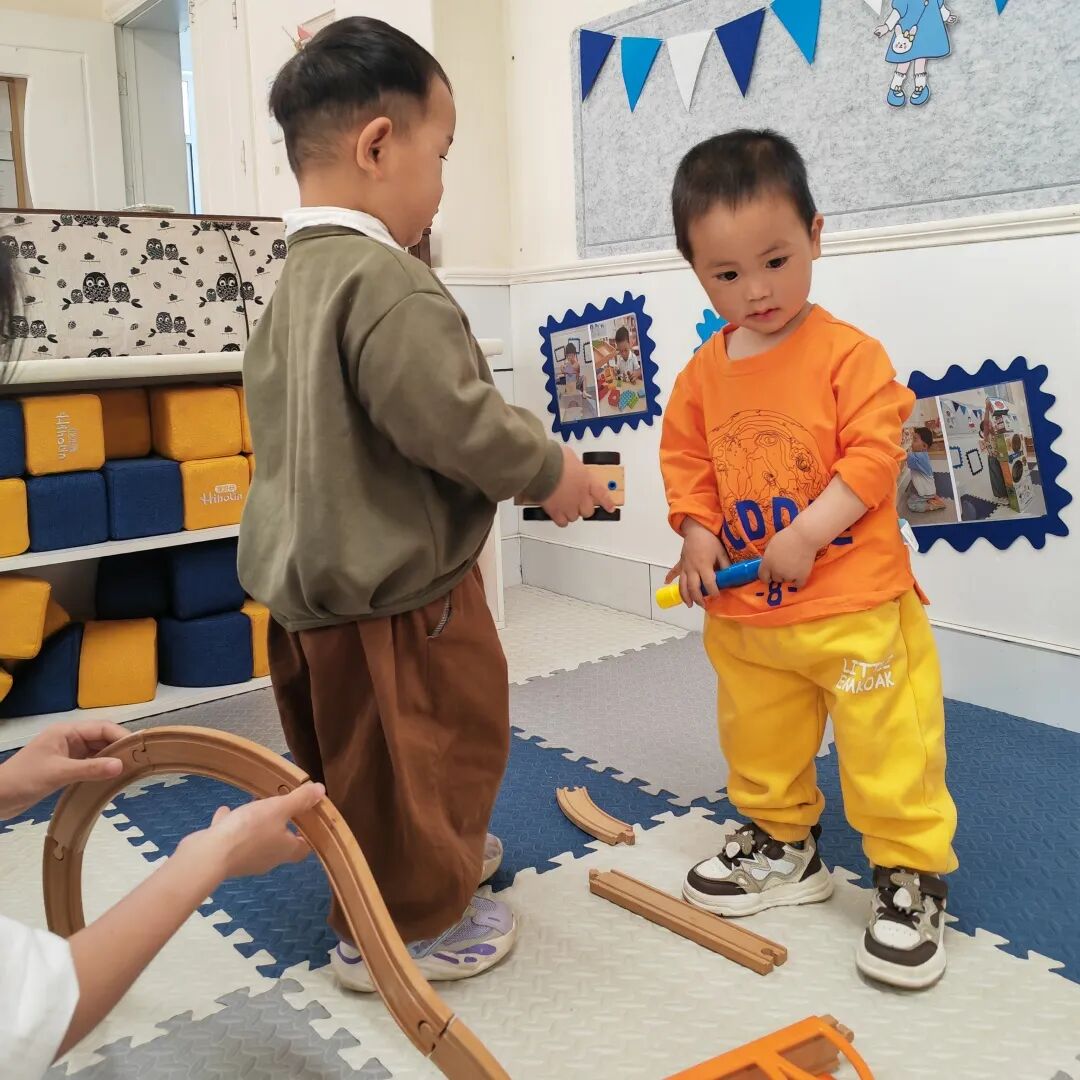 宝贝们开始尝试与身边的小伙伴一起玩玩具~