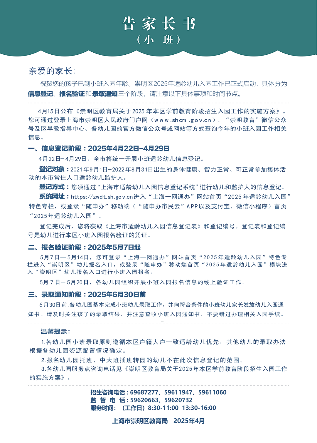 今年崇明区小班入园工作主要通过网上进行,分为信息登记、报名验证和录取通知三个阶段。