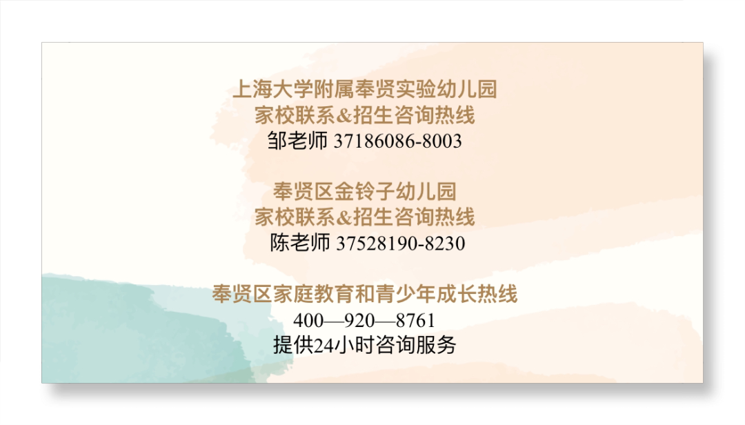 东至浦星公路、南至南行港路、西至贤浦路、北至大叶公路 对口小区/村:天和前滩、禹州雍贤府、龙湖春江天玺 4个小班 1.代办费:课程材料费100元/学期、社会实践活动费100元/学期、生活用品35元/学期 2.保育教育费:二级园175元/月 3.餐费:10元/餐(按当月上学天数结算) 4.点心费:5元/餐(按当月上学天数结算) ①幼儿户籍证明 ②商品住房房地产权证或不动产权证 ③能证明幼儿与产权人关系的户籍证明 ④幼儿出生证明 本次小班幼儿入园流程分为网上信息登记、网上报名验证、录取通知三个阶段。 第一步:网上信息登记 4月22日—4月29日,监护人手机登录“随申办”移动端首页“2024年适龄幼儿入园”或登录“一网通办”网站首页“2024年适龄幼儿入园”特色专栏,网址:https://zwdt.sh.gov.cn,完成网上信息登记,收到“登记编号”短信提示。 第二步:网上报名验证 1.网上报名。5月9日-5月15日,监护人手机登录“随申办”移动端首页“2024年适龄幼儿入园”或登录“一网通办”网站首页“2024年适龄幼儿入园”特色专栏,网址:https://zwdt.sh.gov.cn,点击“奉贤区”进入“奉贤区适龄幼儿入园报名系统”页面,进行网上报名,最后勾选“上海大学附属奉贤实验幼儿园”。完成后收到“报名编号”短信提示。 2.网上验证。5月16日-5月22日,本园按照招生简章、学区划分做好本市户籍学区生网上验证工作。期间,如出现上传材料不完整、有异议等原因,将退回并对监护人注册手机发送短信,请监护人于5月23日前及时进入“奉贤区适龄幼儿入园报名系统”,重新补正相关佐证材料。 第三步:录取通知 6月25日-6月28日,本园对预录取幼儿的家长发送“预录取通知”短信,告知线下录取工作等事宜。请家长关注。 7月1日,开展线下录取工作,发放《录取通知书》。 时间:上午:8:30—11:00 下午:13:00— 16:00 地点:上海市奉贤区北行路118号 1.幼儿入园前必须按照卫生保健相关要求进行健康检查,合格者方可入园。 2.如家长在报名过程中有疑问,可参考《2024年“奉贤区适龄幼儿入园网上报 名”家长问答》提示,或拨打本园咨询电话。 3.如家长确实有困难无法自行完成网上信息登记和网上报名的,可参考公告 《2024年奉贤区适龄幼儿入园线下指导服务点》提示,通过电话预约后前往就近的线下指导服务点寻求现场帮助。 4.外省市户籍入园问题:可拨打所报街镇教育管理办公室咨询电话,见公告 《2024年来沪人员随迁子女入园咨询电话及信息公示网址》。 幼儿园招生咨询电话:37186086-8003 手机:17321419795(邹老师) 幼儿园招生咨询时间: 工作日上午8:30—11:00;下午13:30—16:00 区咨询电话:57422086/57422088 (区托幼服务指导中心) 37597019(区教育局学前教育科) 幼儿园网站:31022600151.age06.com 幼儿园微信公众号: 上大附幼金铃子联合幼儿园