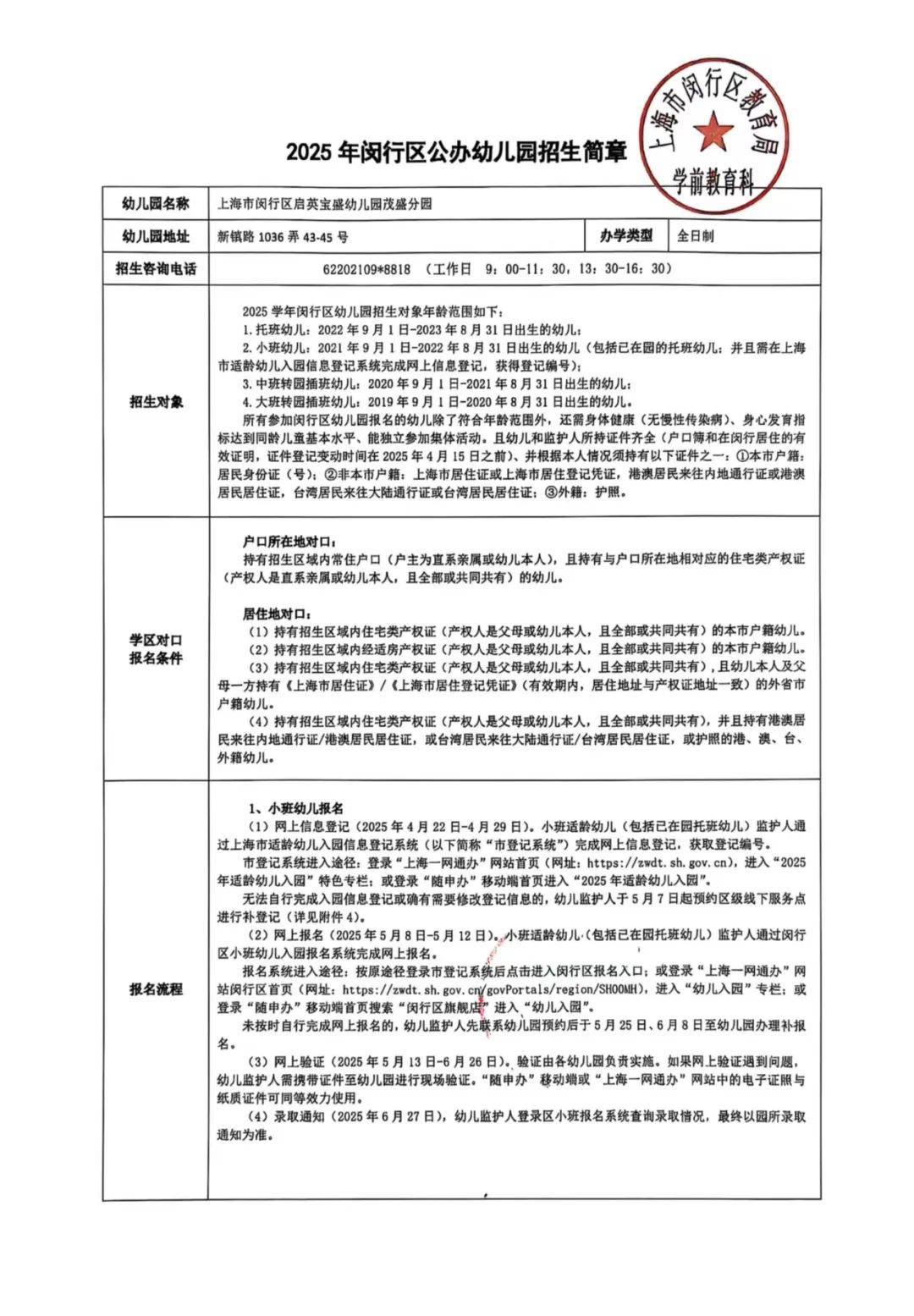 上海市闵行区启英宝盛幼儿园招生咨询电话: